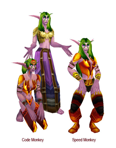 I'm glad you asked (if you didn't ask, you're one of the few people who haven't). The Receptionist is wearing Hyperion Armor on her chest and legs. However, the Hyperion Armor you can find in the game nowadays doesn't look like that anymore (it looks a lot less sexy now, in my opinion). This is why The Receptionist is wearing different leggings in "Speed Monkey" than in "Code Monkey" -- by the time I made "Speed Monkey", WoW had changed the way the leggings looked and I needed to dress her in something else. It's a shame.